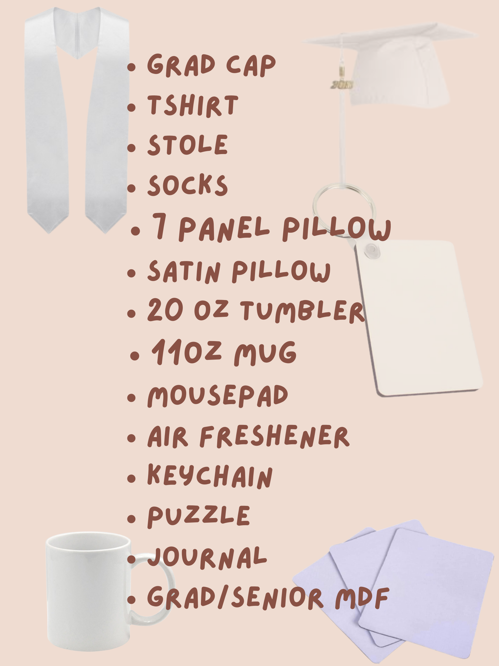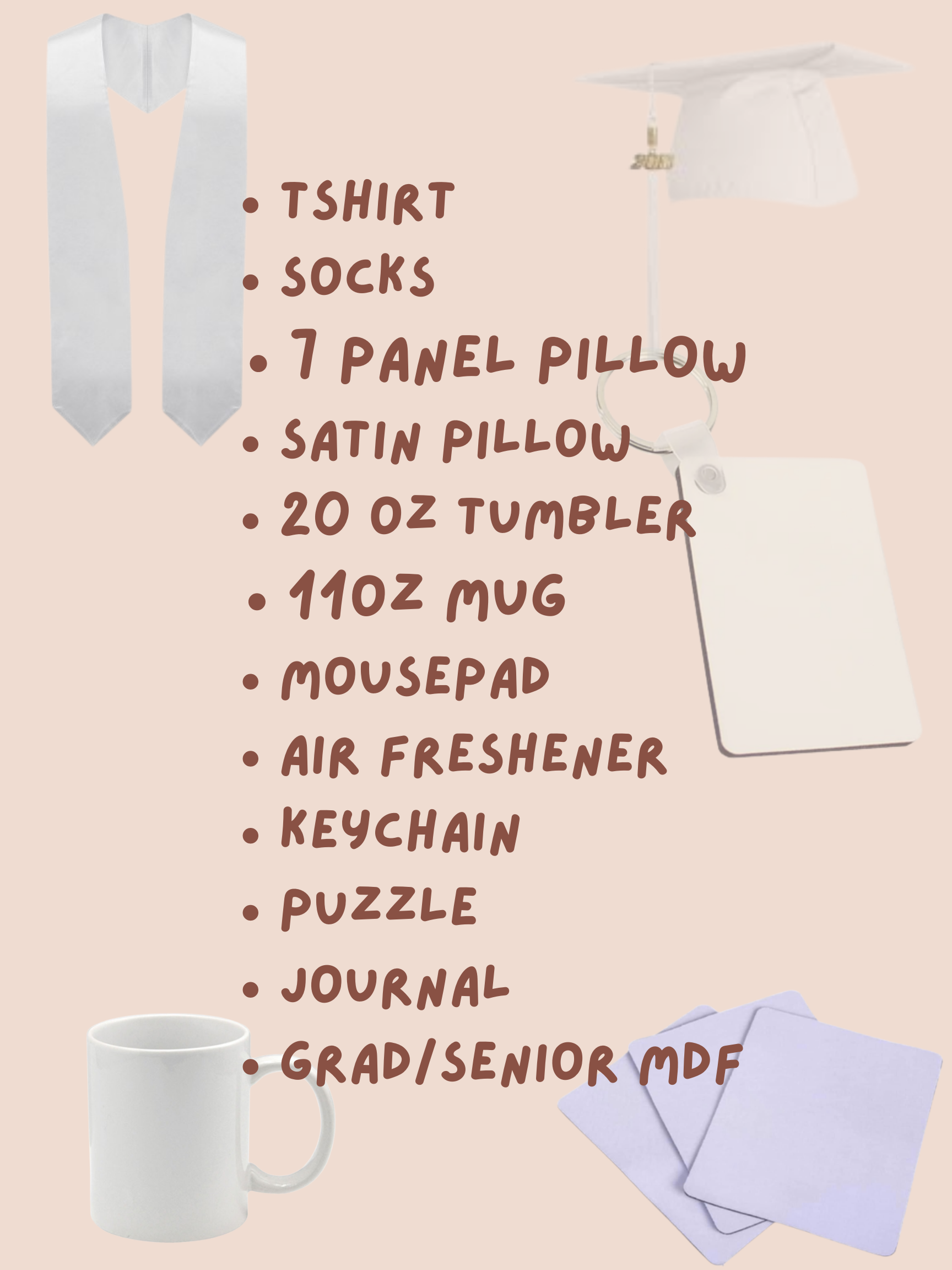This Graduation Craft Kit features high-quality items, including a grad cap, stoles, t-shirt, socks, pillowcases, tumblers, mugs, mousepad, air freshener, keychain, puzzles, journal, and Grad or Senior MDF. Plus, every kit includes at least three free items and free shipping. Celebrate your special achievement with a crafted keepsake you’ll treasure.